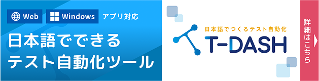 おすすめの自動化手段は、テスト自動化ツール「T-DASH」です。日本語のテストケースからスクリプトを自動生成でき、プログラミングの知識が必要ありません。教育コスト・導入コストを抑えてテスト自動化を実現できます。詳しくはこちらをご覧ください。