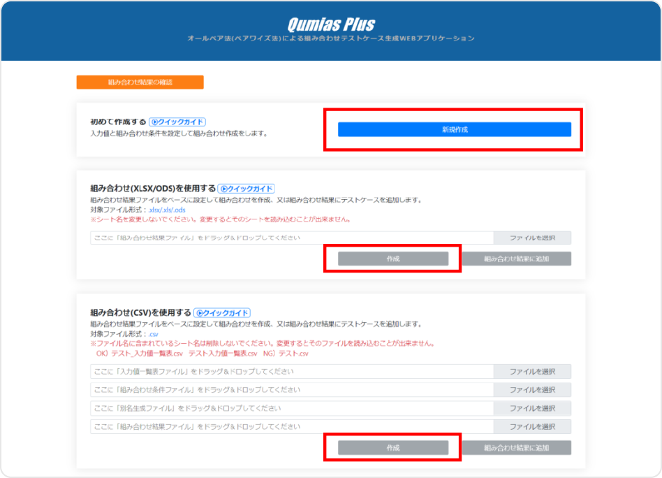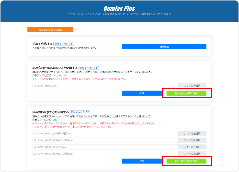 過去に組み合わせ作成したファイルをベースに作成したい場合は、XLSX、又はCSVで組み合わせ結果ファイルをアップロードし、「作成」をクリックすることで使用できます。(CSVは1ファイルから作成可能)