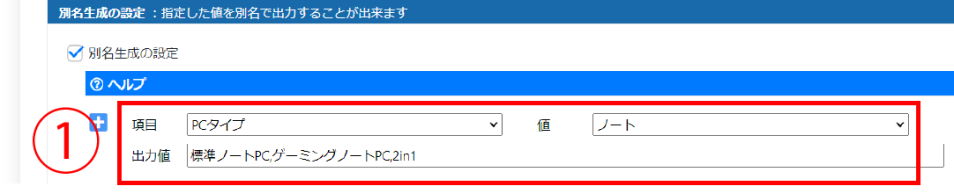 ① 変更したい対象の値を選択し、出力値に別名で出力したい値を入力します。