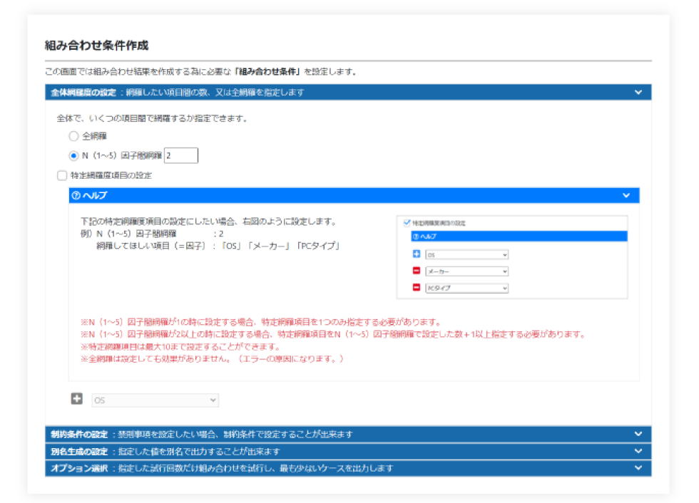全体網羅度(全網羅もしくはN因子間網羅)および制約・禁則条件を設定します。