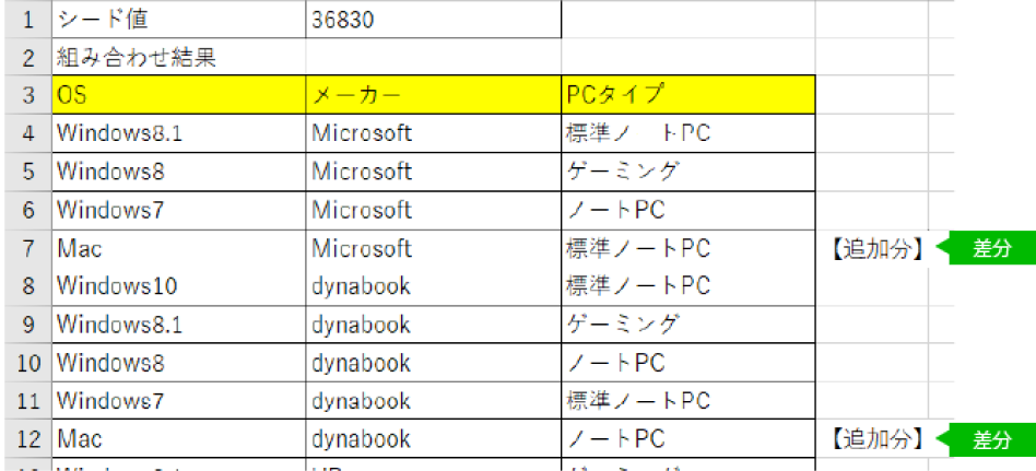 「組み合わせ追加」の組み合わせ結果は、アップロードした組み合わせ結果と比較し、差分があるテストケースには【追加分】と表示されます。